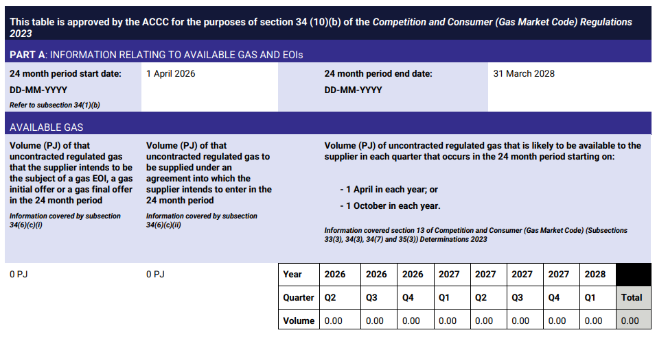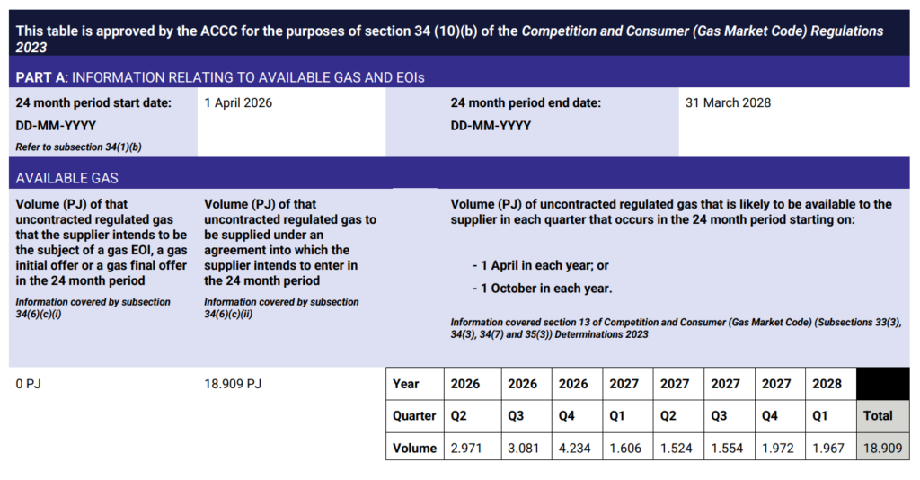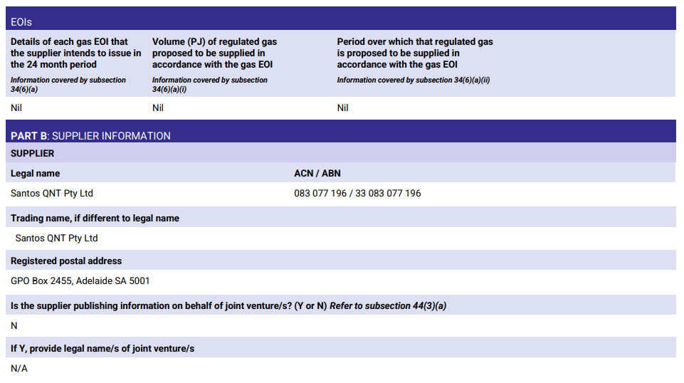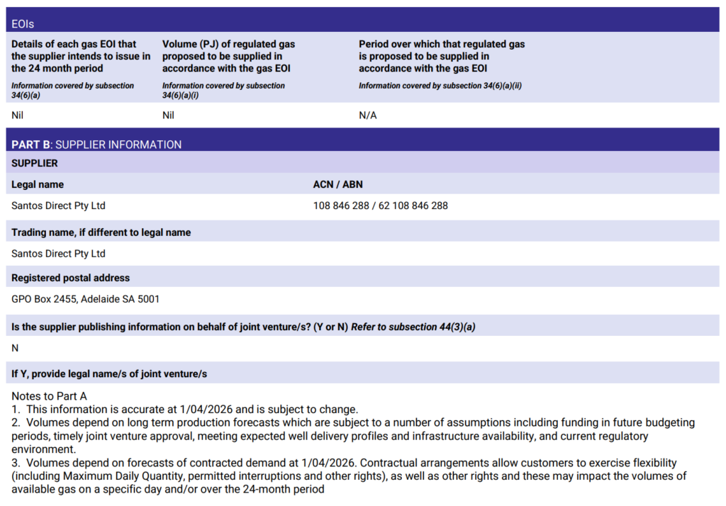 In accordance with the requirements of section 34(10)(b) of the Competition and Consumer (Gas Market Code) Regulations 2023 Santos publish the following information relating to uncontracted gas and Expressions of Interest for the reporting year 1 April 2026 to 31 March 2028.